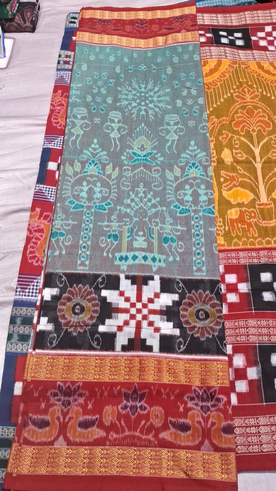 🌿 Traditional Handloom Saree – Multicolor Temple & Ikat Design