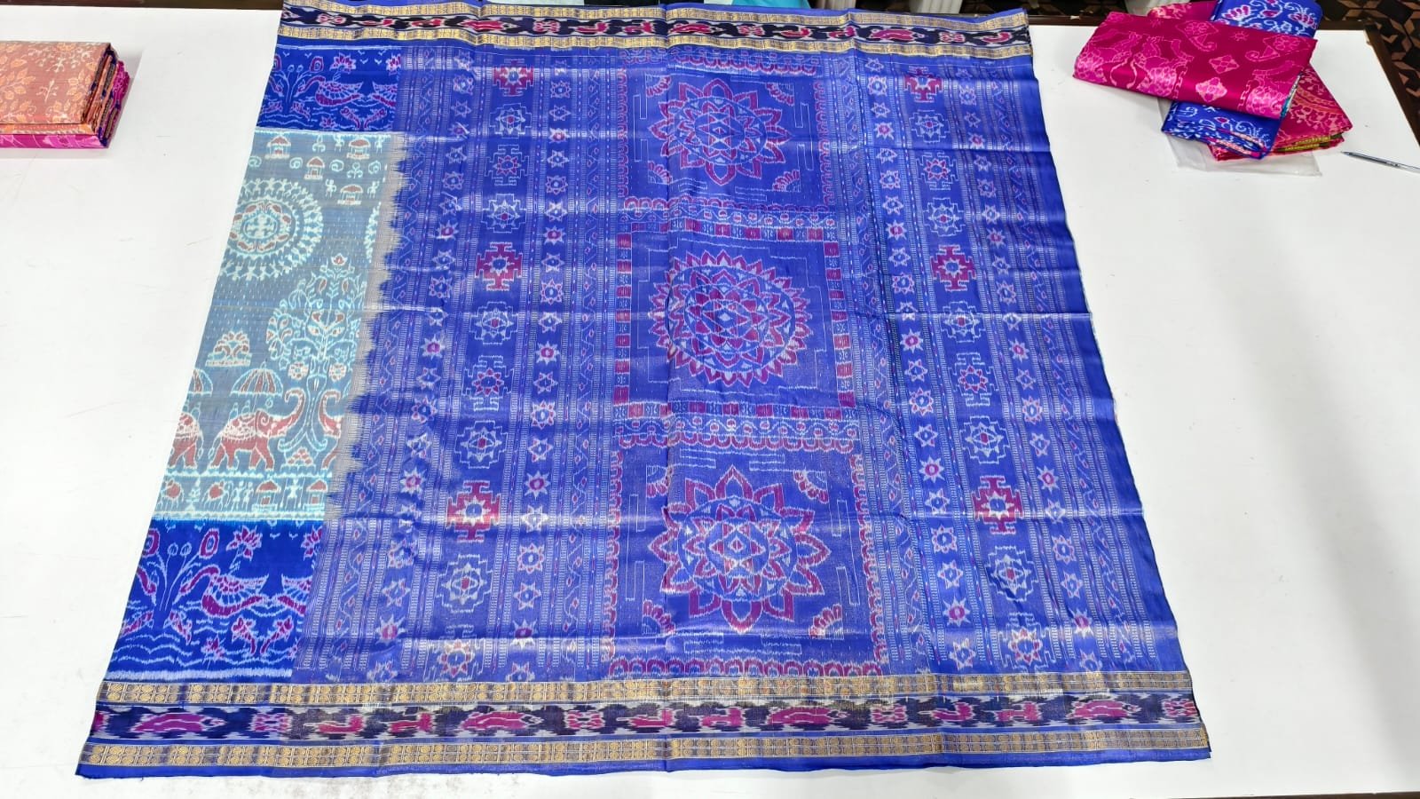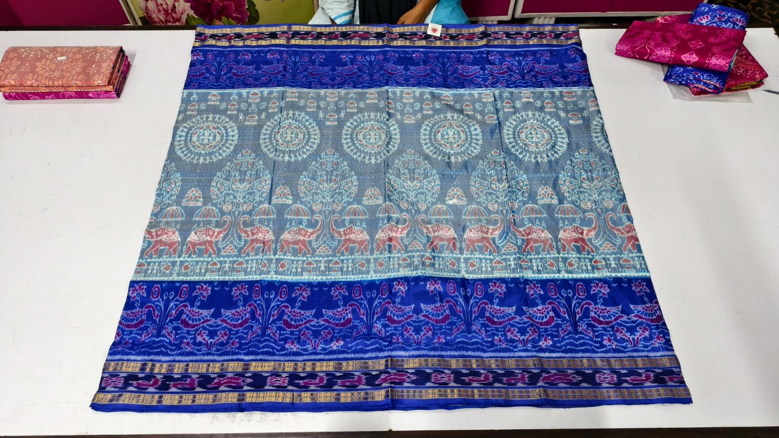 • Pallu Design: Traditional tribal and elephant motifs with floral and paisley detailing